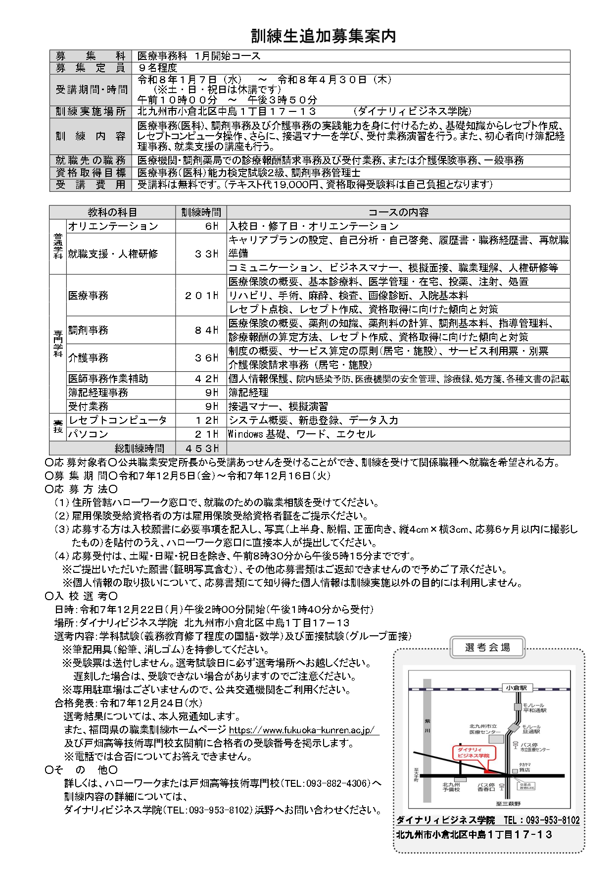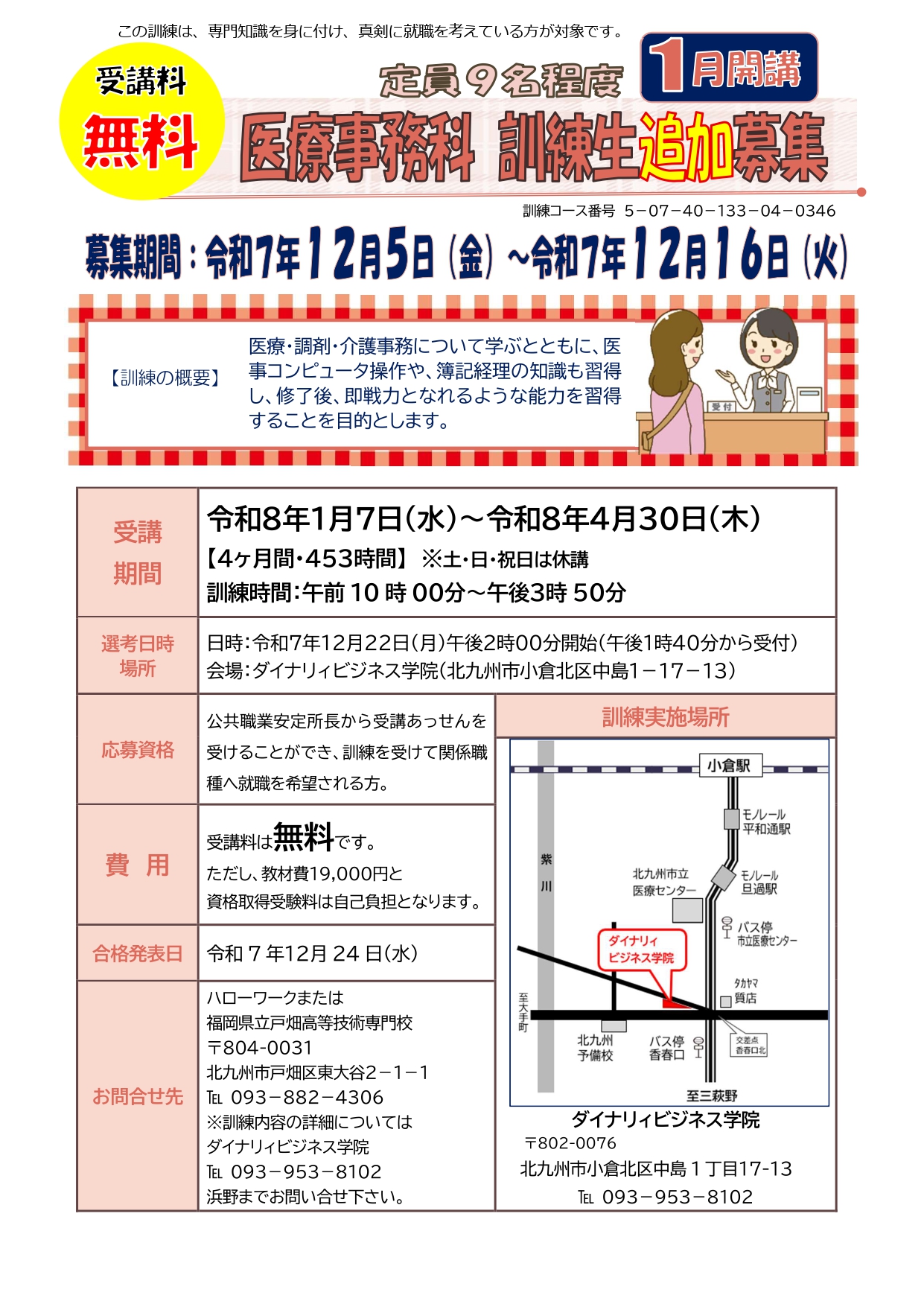 訓練生追加募集!★来年1月スタート★公共職業訓練・医療事務科 (2025/12/16締切)