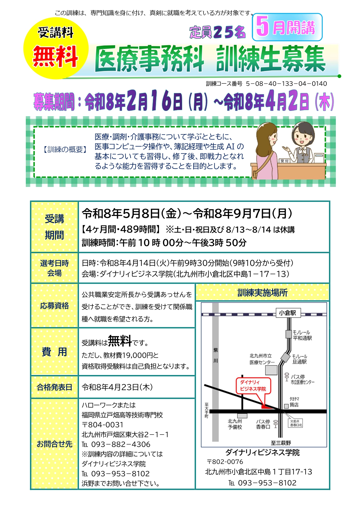 訓練生募集!★令和8年5月スタート★公共職業訓練・医療事務科 (4/2応募締切)
