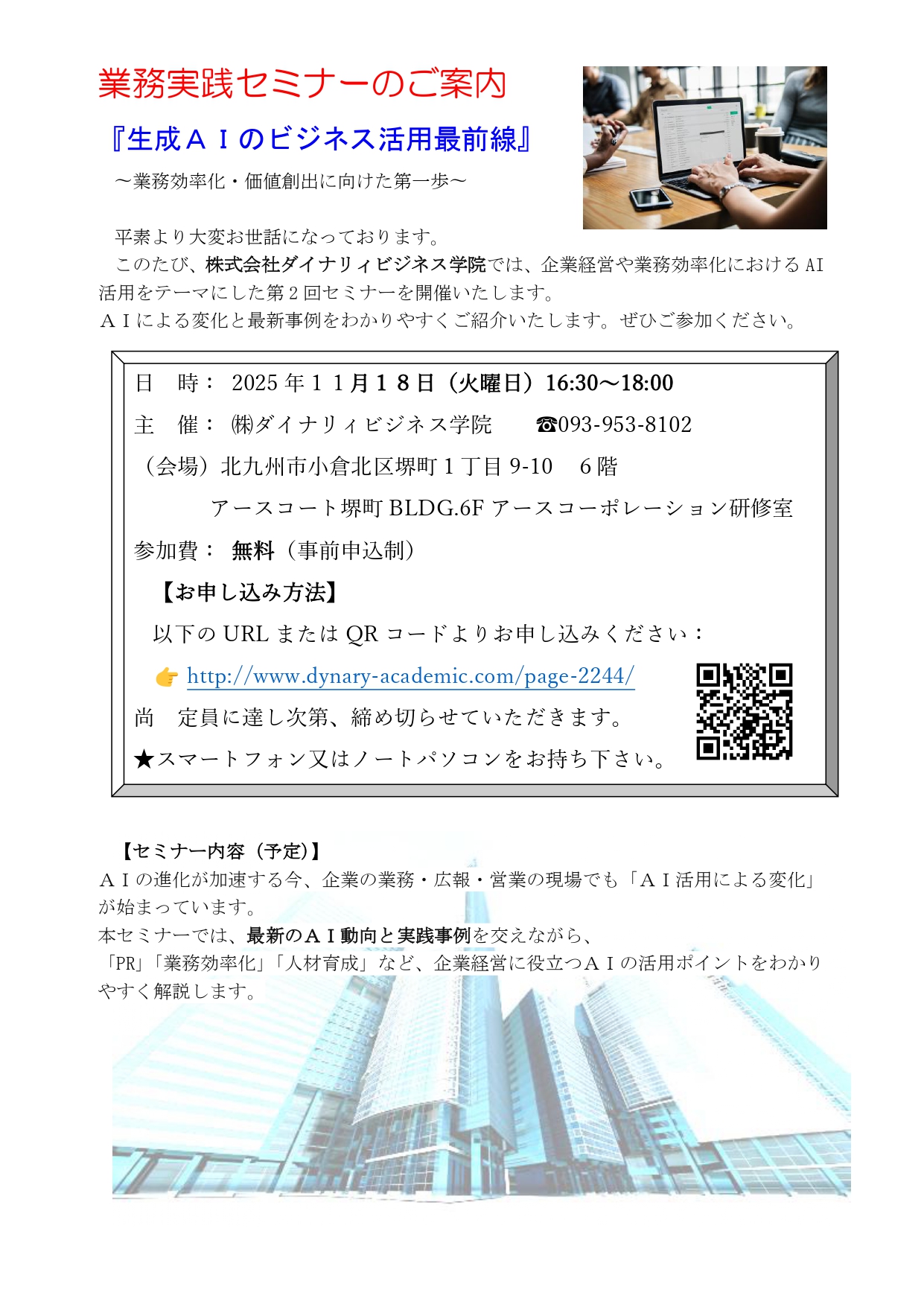 主 催: ダイナリィビジネス学院 ☎093-953-8102